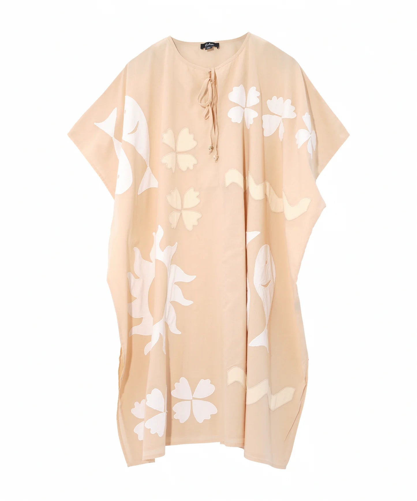 Featuring appliqué cut-outs of motifs from the Resort Collection, this mid-length caftan makes a bold, statement-ready impression. Inspired by Montauk’s coastal treasures and Hockney’s vibrant LA imagery, its neutral palette pairs seamlessly with other Echo accessories.